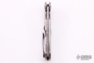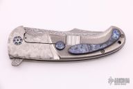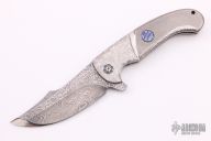 This Persian framelock folder by Eric Ochs features a Damascus blade with flipper. Handle has a stonewashed and carved titanium frame, black timascus tip up clip, backspacer and lock bar stabilizer. Nice blade seating, detent and lockup, rides on bearings. Great work. Excellent condition. Comes with a zippered case.