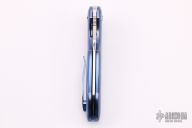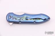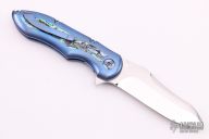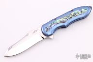 This Max Evo flipper by Jerry Moen features a mirror polished blade with flipper and notched thumbrest. The handle has an anodized titanium frame with abalone inlays, single titanium liner, anodized titanium backspacer, and a tip up titanium clip with hidden screws, has anodized titanium hardware. Rides on bearings. Nice detent, lockup and blade seating. Has a few light scratches, otherwise excellent condition. Comes with a zippered case.