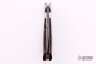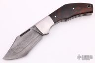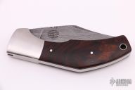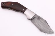 This Superbad Collab by Tashi Bharucha and Franck Souville features a Damascus blade with nail nick. The handle has satin finished stainless steel dovetailed bolsters, ironwood scales, stainless steel liners and spring. Nice strong spring, nice blade seating. Comes with a zippered case. Excellent condition.