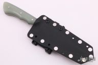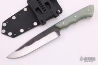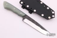 This knife by Master Smith Murray Carter features a hand forged blade made Blue Steel core laminated between spring steel. This steel affords the keenest possible edge. The handle has jade G-10 scales with black G-10 liners and nickel silver pins. .128" thickness with a 1.246" blade depth, full tapered tang. Comes with kydex sheath with TekLok. Excellent condition.