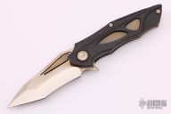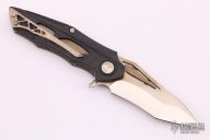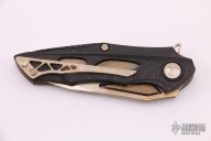 This Noah Flipper from Dew Hara is part of a limited edition of 15 pieces, this one is #2. It features a two-tone recurved tanto style blade with brass insert in fullers, notched thumbrest and flipper. The handle is comprised carbon fiber scales with antiqued brass inlays, bronzed stainless steel liners and a satin finished stainless steel backspacer. Skeletonized stainless steel tip up clip is positioned for right hand carry. Includes velcro cloth pouch. Nice detent and lockup, rides on bearings, has a few light scratches, otherwise excellent condition.
