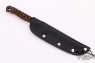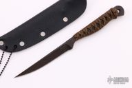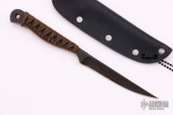 This custom fixed blade by Dennis Cook features a black coated blade with notched thumbrest, .256" blade stock and .567" blade depth, full tang construction with a cord wrapped handle. Nice feel in handle. Includes a kydex sheath. Excellent condition.