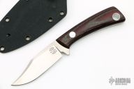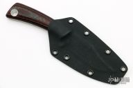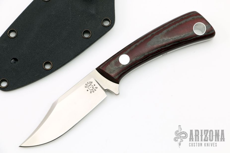 This TK-4 Bowie by Tom Krein features a satin finished blade with .129" blade stock and .909" blade depth. The handle has red canvas micarta and carbon fiber scales with aluminum pins and lanyard tube over full tang construction. Includes Kydex sheath.  Excellent condition. Dated 2006.