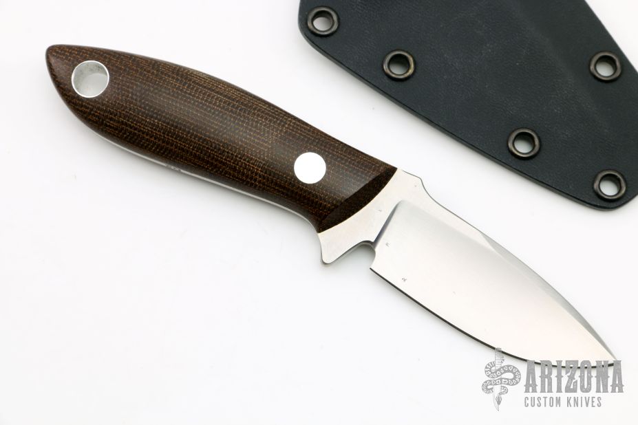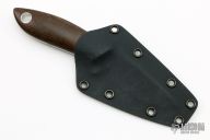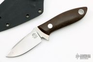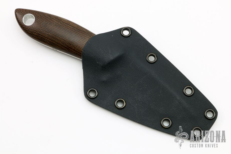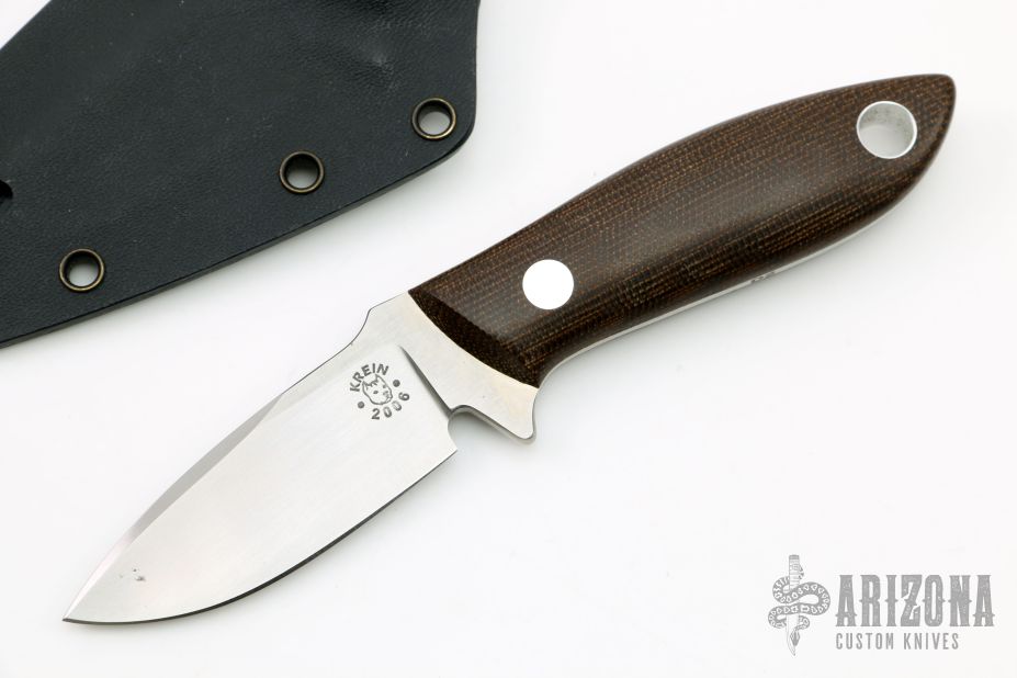 This Small Utility by Tom Krein features a satin finished drop point blade with thumb ramp, .131" blade stock, .944" blade depth, and full tang construction. The handle has green canvas micarta scales, aluminum pin and lanyard hole. Comes with a kydex sheath. Minor scratches on the blade and a couple oxidation spots, otherwise good condition. Dated 2006