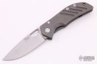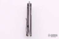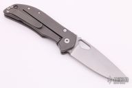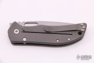 This El Patron framelock folder from Calavera Cutlery features a bead blasted drop point blade with notched thumbrest and thumbhole. The handle has a tumbled titanium frame with a matching tip up clip. Nice detent, lockup, and blade seating. Light Scratches are visible on the pocket clip otherwise the knife is in Excellent Condition.