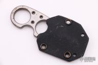 This Silent Soldier by Brous Blades has a two-tone wharncliffe blade with notched thumbrest. Has matching finish on the handle with 3-finger ergonomics. .246" blade stock, 1.328" depth. Has scratches and oxidation, otherwise good user condition. Comes with Kydex sheath.
