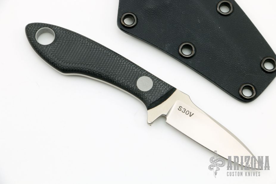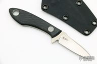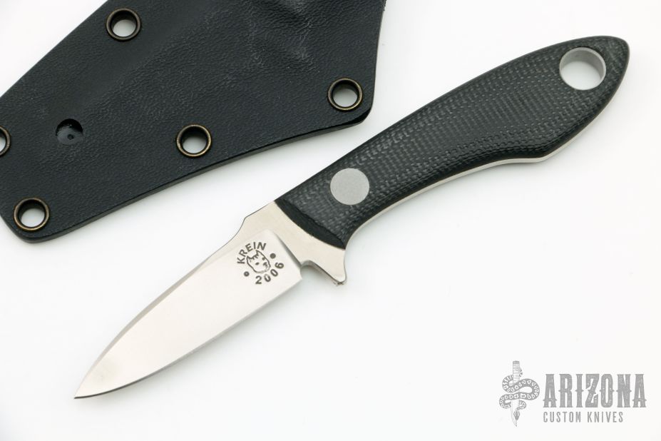 This custom fixed blade by Tom Krein features a satin finish blade and tang. Black G-10 scales. Full tang construction with .094" blade stock and .702" blade depth. Includes a black kydex neck sheath. Excellent condition. Dated 2006