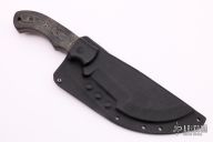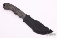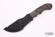 This Tom Brown Tracker by Tops features a black coated blade with sawteeth on the spine, .240" blade stock and 2.404" blade depth, full tang construction. The handle has black/green linen micarta scales with red liners. Comes with a kydes sheath. Has some sheath marks, otherwise excellent condition.