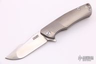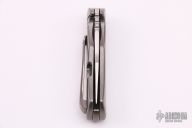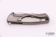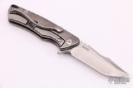 This S-2 flipper by Michael Zieba features a satin finished blade with notched thumbrest and flipper. The handle has a titanium frame with milling, has a titanium backspacer and tip up clip. Nice detent, lockup and blade seating. Rides on bearings. Has stainless lockbar insert.  Includes padded zippered case.  Excellent condition.