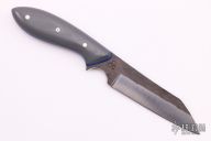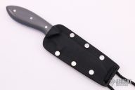 This Neck Knife by Murray Carter features a San Mai sheepsfoot style blade with 0.118" blade stock and 0.943" blade depth, full tapered tang construction. The handle has grey G-10 scales over blue G-10 liners with mosaic and nickel silver pins. Includes kydex neck sheath with paracord. Has some sheath scratches, otherwise excellent condition.