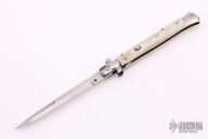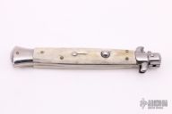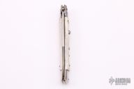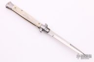 This swivel bolster auto by AB Italy features a tumbled and polished blade with a false top edge. The handle has stainless steel bolsters and butt, stag scales and brass liners. Strong opening. Has safety. Has a few light scratches, otherwise excellent condition.