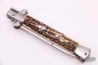 This Swivel Bolster from ACK Italy features a polished blade. The handle is comprised of stainless steel bolsters and pommel and stag scales over brass liners and steel backspacer. Has a couple light scratches, otherwise excellent condition.