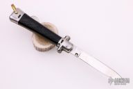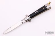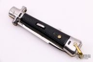 This Automatic by Bargeon features a mirror finished drop point blade with swedge. The handle has stainless steel bolsters and pommel with checkered plastic scales over coin edged brass liners and stainless steel lockbar. Push button release, sliding safety and brass lanyard bail. Has a few light scratches, otherwise excellent condition.