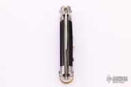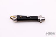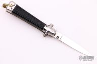 This Automatic by Bargeon features a mirror finished drop point blade with swedge. The handle has stainless steel bolsters and pommel with checkered plastic scales over coin edged brass liners and stainless steel backspacer. Push button release, sliding safety and brass lanyard bail. Has a few light scratches, otherwise excellent condition.