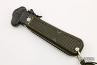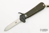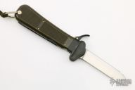 This German Army Paratrooper Knife from Bund features a spear point satin finish gravity blade. The handle is comprised of a steel guard and lever with OD Green plastic scales over metal frame. D Ring lanyard bail and lanyard on pommel. Knife also features a steel C4 punch/Marlin spike that deploys to the rear of the knife. Excellent condition.