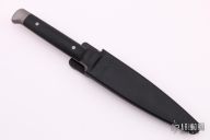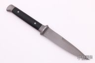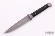 This Military Boot Knife by Kershaw features a spear point bead blasted blade with false top edge, .175" blade stock and .906" blade stock at the ricasso, integral construction with black inlays. Comes with black plastic sheath. No. 4351 on the blade. Has a crack in one of the scales, otherwise good condition.