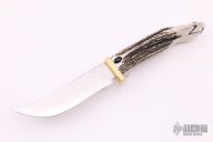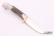 This knife by Ted Miller features a mirror polished upswept blade with .132" blade stock and 1.234" blade depth, hidden tang construction. The handle has a brass guard and a carved stag grip with small tiger eye inlays in the vulture's eyes. Comes with a stag and stone display stand and COA. Excellent condition. #2523