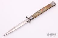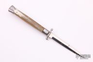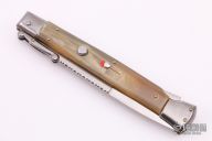 This 11" Swing Guard Auto by Frank Beltrame features a polished bayonet ground blade with false top edge and fileworked spine. The handle has stainless steel bolsters, front and rear, honey horn scales, brass liners, fileworked stainless steel backspacer. Has some light scratches, otherwise excellent condition.