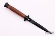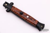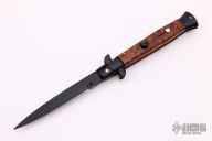 This Swivel Bolster Auto has a black stainless steel spear point blade. The handle is composed of a black steel front and rear bolsters, frame and liners all complemented by simulated wood scales. Excellent Condition.