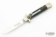 This Leverletto Lever Lock Auto has a mirror polished stainless steel spear point blade with fileworked spine. Handle has stag scales, fluted nickel silver front and rear bolsters, stainless steel liners and back spacer, and nickel silver lock release button. Excellent condition.