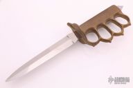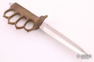 This is a reproduction of a WWI trench knife made by L.F & C. Cast Brass handle with U.S. 1918 stamped. Edges are not sharpened, has a few scratches and the casting is a little rough, otherwise excellent condition.
