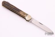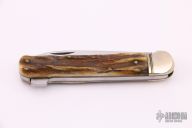 This vintage lockback by Hubertus features a spear point blade, nickel silver bolsters, stag scales, and brass liners and pins. Nice lockup. Has some light scratches, otherwise excellent condition.