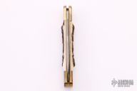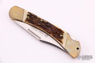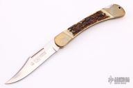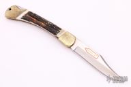 This Puma Prince lockback has a brass frame with stag scales. The blade is satin finished with nail nick. Has some light scratches, otherwise excellent condition. #31791
