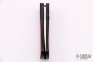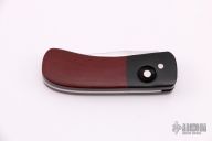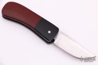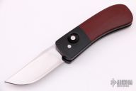 This custom automatic features a mirror polished clip point blade and black paper micarta frame with red linen micarta scales. Stainless steel backspacer. Strong and fast coil-spring opening. Perfect function. Has some light scratches, otherwise excellent condition.