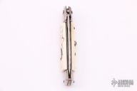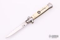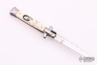 This swivel bolster auto by Italy features a polished blade with fileworked spine. The handle has stainless steel bolsters and butt, mammoth ivory scales with scrimshaw by "Goff" and dated 1988, brass liners. Strong opening. Has safety. Has a few light scratches, otherwise excellent condition.