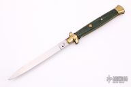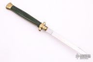 This Swivel Bolster from Italy features a satin finished blade with false top edge. The handle is comprised of brass bolsters and pommel with wood scales over brass liners and stainless steel backspacer. Has some light scratches, otherwise excellent condition.
