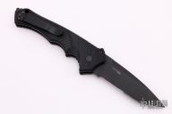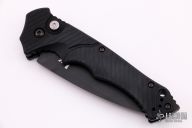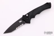 The Benchmade H&K MP5 auto knife was modeled after the late Benchmade Harley-Davidson Nonconformist automatic knife and was developed as a tribute to the legendary H&K MP5 firearm. The entire H&K line of knives are all manufactured by Benchmade and carry their limited lifetime warranty and are eligible for all Benchmade services. The black anodized machined aluminum handle incorporates style and sophistication with the bi-directional milling, ergonomic design and an extended back spacer that acts as a glass breaker. Additionally, the handle scale provides several precise jimping locations for multiple grip options and the knife has an integrated slide safety found on the spine of the handle. This model includes a premium 154CM stainless steel drop point tanto blade, that is partly serrated, with a black finish. The pocket clip is designed for tip up carry only and offers a left or right hand carry option. Made in the USA. Excellent condition.