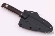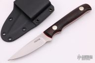 This Crotts Caper by Dan Crotts features a satin finished blade, .095" blade stock and .700" blade depth, full tang construction. The handle has Cocobolo scales with red G-10 liners and brass pins. Comes with a kydex sheath with belt clip. New from maker.