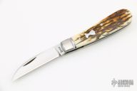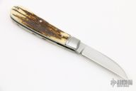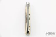 This slipjoint by Jim Dunlap features a hand rub satin finished blade with nail nick. The handle has pinched and fluted steel bolsters, mammoth covers all complimented by a stainless escutcheon.  Has half-stop, flush in all positions. Comes with a zippered case and COA. New from maker.