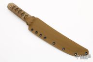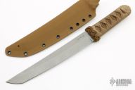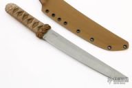 This Kuzuri from Ben Tendick of B.R.T. Bladeworks features an acid etched upswept blade with swedges. .208" Blade stock 1.25" Blade Depth. The handle is comprised of a Turk's head bolsters and epoxy soaked tsuka wrap over cord underwrap. Includes kydex sheath and a C.O.A. Brand New from Maker.