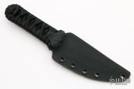 This 4" Aikuchi from Ben Tendick of B.R.T. Bladeworks features an acid etched kwaiken style blade with swedges. .179" Blade stock 1.008" Blade Depth. The handle is comprised of a Turk's head bolsters and epoxy soaked tsuka wrap over a sting ray underwrap and a hammered titanium menuki. Includes kydex sheath. Excellent condition. Includes C.O.A.