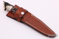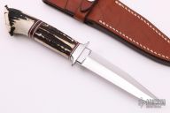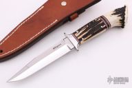 This Boot Knife by Mamoru Shigeno features a mirror polished blade with sharpened top edge, .185" blade stock and .945" blade depth, hidden tang construction. The handle has a stainless steel guard, stag grip and micarta spacers. Comes with a brown leather sheath. Excellent condition.