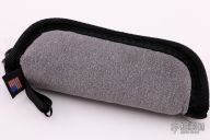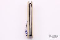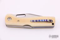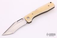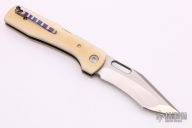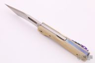 This Mid-lock by Jim Burke features a satin finished blade with thumbhole. The handle has ivory paper micarta scales, blasted titanium liners, mokuti backspacer and tip up clip with hidden screws, stainless steel lockbar. Excellent condition. Comes with a zippered case.