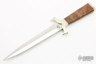 This presentation dagger shows off Don's impeccable fit and finish. The long slender Damascus blade is deeply hollow ground on both edges. .183" Blade Stock. 1.115" Blade Depth. The handle features a nickel silver guard and butt cap complemented by a wood grip. Includes a padded zippered case. Light scratches are visible on the guard otherwise the knife is in excellent condition.