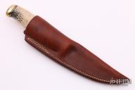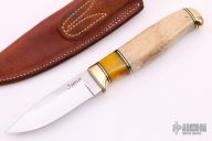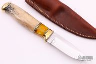 This Knife by the Late Tiny Spencer features a mirror polished blade with .138" blade stock and 1.118" blade depth, hidden tang construction. The handle has a brass guard and butt with an Oosic grip and amber spacer. Has some light scratches, otherwise excellent condition. Comes with a brown leather sheath.