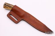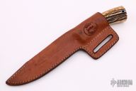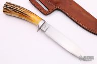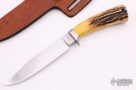 This Hunter from Master Smith Jerry Fisk features a clip point hand rub satin finished blade with .204" blade stock and 1.099" blade depth, hidden tang construction. The handle is comprised of a stainless steel single guard and a stag grip with an inlay in the butt and a lanyard hole. Includes a Rowe's Leather Sheath with belt loop. Excellent condition.