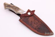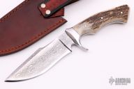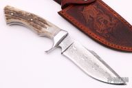 This Knife by Shehroz Azmat features a 1000 Layer of (1095 and 15N20) Mosaic Star Basket Damascus blade with .228" blade stock and 1.623" blade depth, full tang construction.  The tang is also Damascus, but it is not etched, you can see the pattern if you look closely. The Handle has a stainless steel guard and great looking stag scales with brass pins. This Knife comes with a hand tooled brown leather sheath. Comes with original box. New from maker.