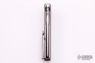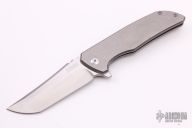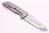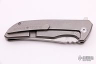 This Bold by Michael Zieba features a satin finished blade with notched thumb rest and flipper. The handle is comprised of a tumbled titanium frame over matching back spacers with lanyard pin. The titanium tip up clip is positioned for right hand carry. Includes padded and zippered case. Excellent Condition.