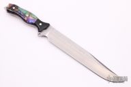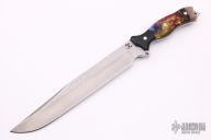 This Custom Shop Jack Hammer 10 by Busse Knives features a textured blade with .211" blade thickness and 1.547" blade depth, full tang construction. The handle has black G-10 bolsters and liners, and resin and wood scales with mosaic pins. New from maker.