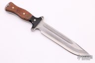 This Team Gemini Light Brigade by Busse Combat Knife Company features a drop point blade with fullers and textured flats, .223" blade stock and 1.573" blade depth, full tang construction. The handle is comprised contoured black canvas micarta bolsters and liners, crosscut scales with mosaic pins. Exposed tang pommel with lanyard hole. New from maker.