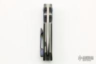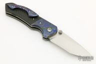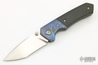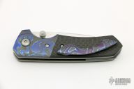 This Elder from Brian Efros features a drop point recurve blade with dual bead blasted thumbstuds. The handle is comprised of Dark Ti Bolsters, Zirconium pivot collars, and carbon fiber scales. Dark Ti backspacer, and Dark Ti clip positioned for tip up carry. Very nice action, detent, and blade seating. Comes with Zippered case. New condition.