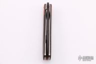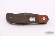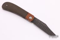 This Lanny's Clip Front Flipper Linerlock by Enrique Pena features a Damascus blade with front flipper and notched thumbrest. The handle has brown canvas micarta bolsters, green canvas micarta covers with a stainless steel escutcheon, black liners and spacer, stainless steel liners and brown canvas micarta backspacer. Comes with a zippered case. Excellent condition.