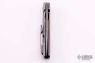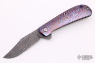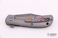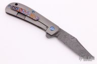 This Lanny's Clip flipper from Enrique Pena features a Damascus blade with notched flipper. The handle has a MokuTi and bead blasted titanium frame, MokuTi tip up clip, anodized titanium backspacer. This knife flips well with no wrist action needed. Blade is centered when closed and locks up with no blade play. Comes with nylon zippered case. Excellent condition.