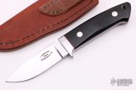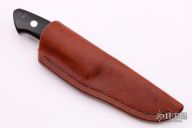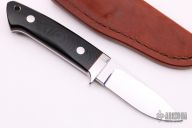 This Loveless Style Drop Point by James Sponaugle features a mirror polished drop point blade with .192" blade stock and 1.038" blade depth, full tapered tang construction. The handle is comprised of a stainless steel single guard with black linen micarta scales over red liners/spacers. Includes brown leather sheath with belt loop. Excellent condition.