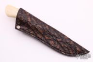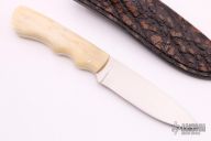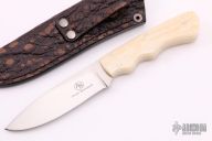 This knife features a satin finished drop point blade, .125" blade stock and 1.097" blade depth, full tapered tang construction. The handle has giraffe bone scales. Comes with a brown leather sheath. Includes the original box.  Excellent Condition.