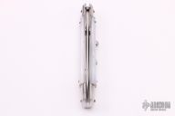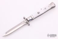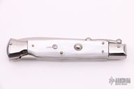 This Swing Guard Lockback Auto by AKC Italy has a polished stainless steel spear point blade with false top edge. Handle has acrylic scales with stainless steel bolsters, brass liners, and stainless steel back spacer and lock. Has safety. Has a few light scratches, otherwise excellent condition.